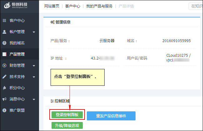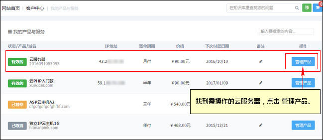 第1步:登錄會員中心,在首頁 “我的產品與服務”板塊點擊“雲服務器”項,或者點擊首頁左側導航欄“產品管理”,找到您需要登錄的雲服務器,點擊“管理產品”按鈕。